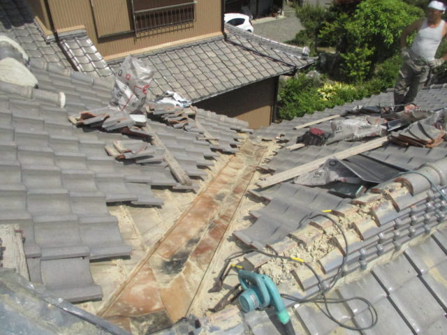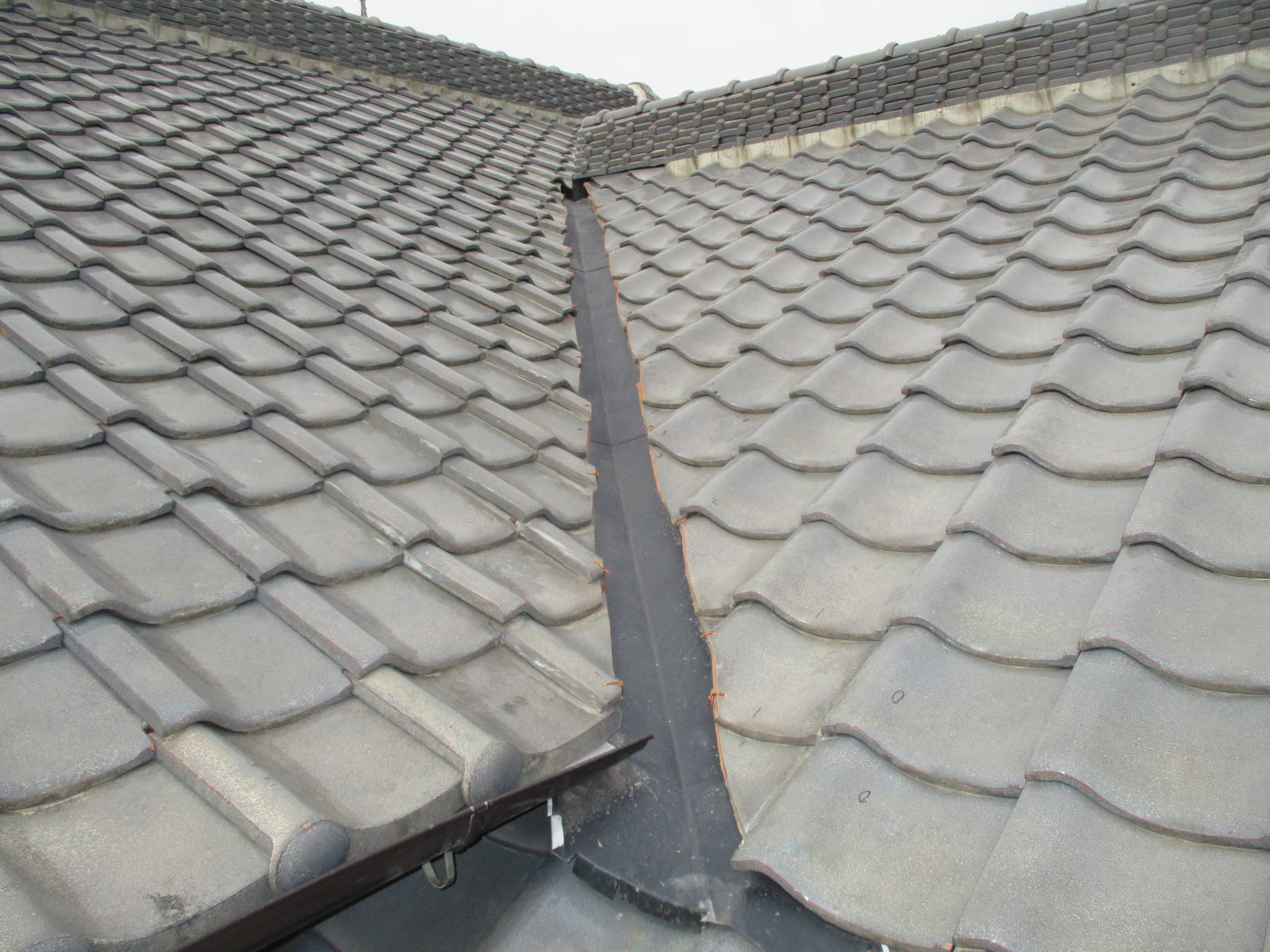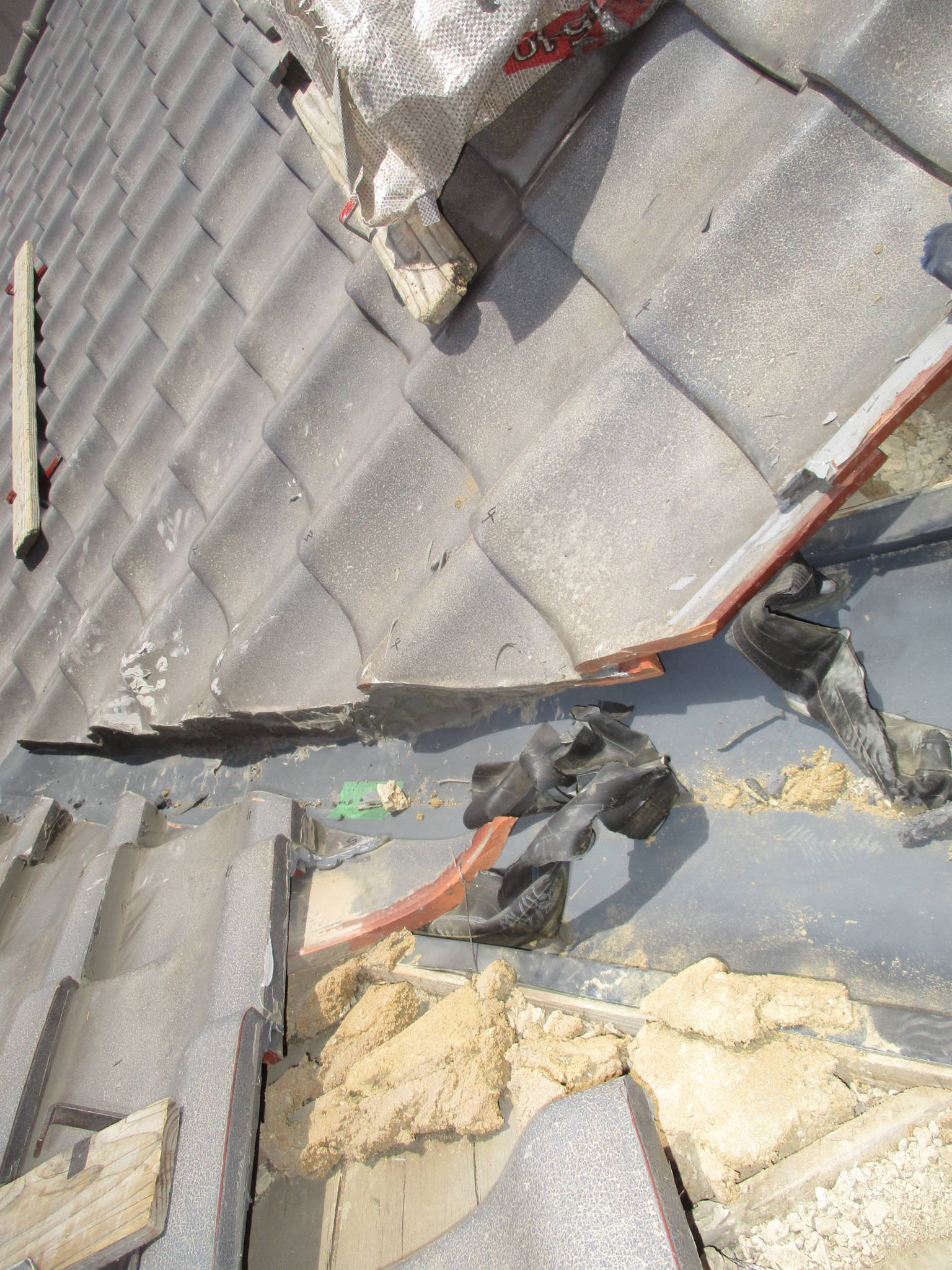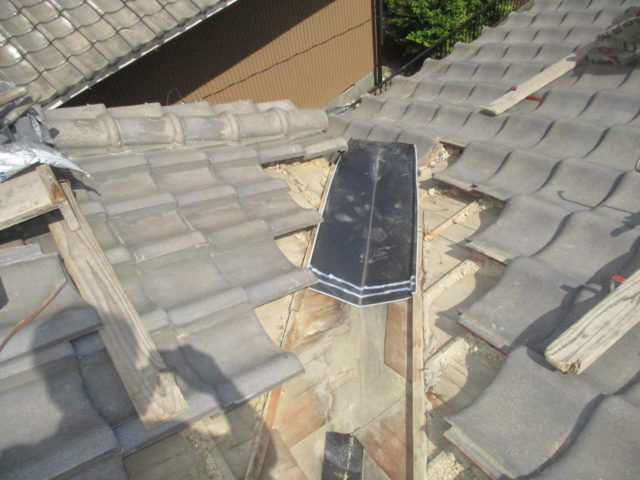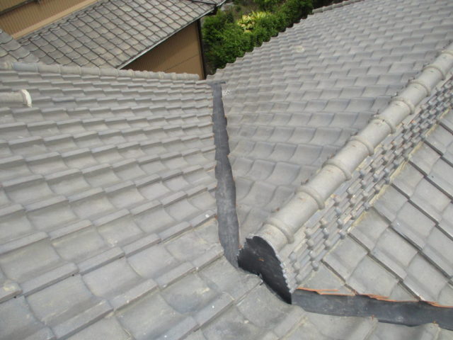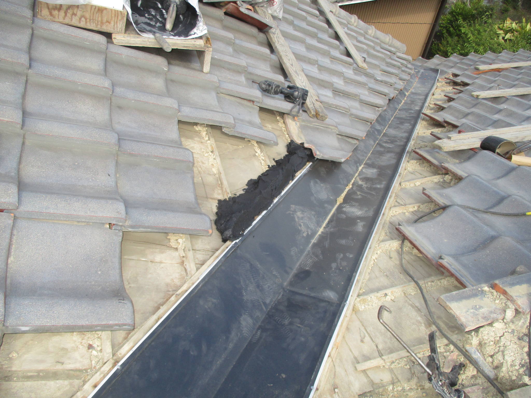 谷部分の瓦を一度取り外し、下地を確認しました。古い銅板や土の劣化が見受けられました。