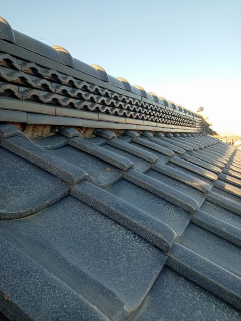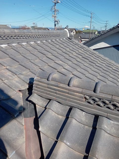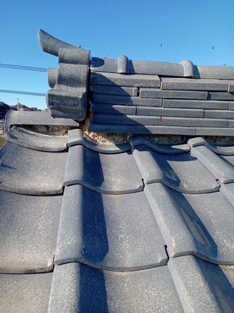 写真でも分かるように、棟部分や取り合い部の漆喰が剥がれ、ところどころ中の土が露出している箇所がありました。雨風にさらされることで、雨漏りや棟瓦のズレ・崩れにつながる恐れもある状態でした。