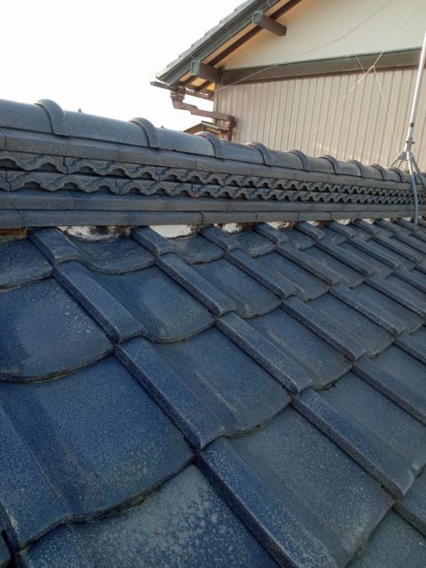 工事後は、棟部がまっすぐ整い、白い漆喰がアクセントとして際立つ美しい屋根に。機能面だけでなく、景観も大きく向上しました。特に棟の重なり部分やのし瓦の納まりが整っており、伝統的な日本瓦の美しさがしっかりと引き立っています。