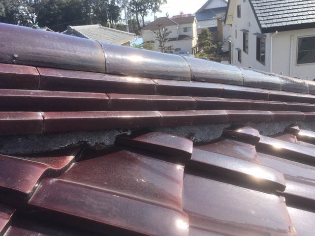 今回のお宅では、棟瓦の漆喰が風化して剥がれており、下地の土が露出していました。そのままでは瓦がずれたり、雨水が侵入して建物内部にダメージを与える恐れがあるため、既存の劣化した漆喰を取り除き、新たに漆喰を詰め直す補修工事を行いました。