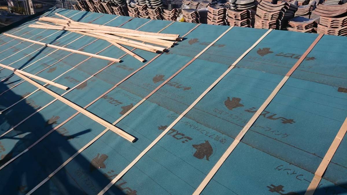 これが屋根の二次防水となり、万が一瓦の下に雨水が入り込んでも、家の中に浸入するのを防ぎます。