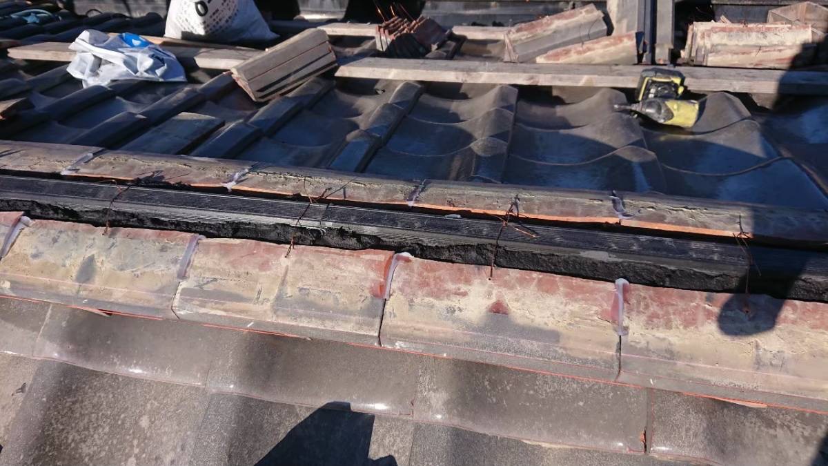棟瓦(屋根の頂上部分)も積み直しを行い、棟芯木の交換・銅線でのしっかりした固定を実施しました。
