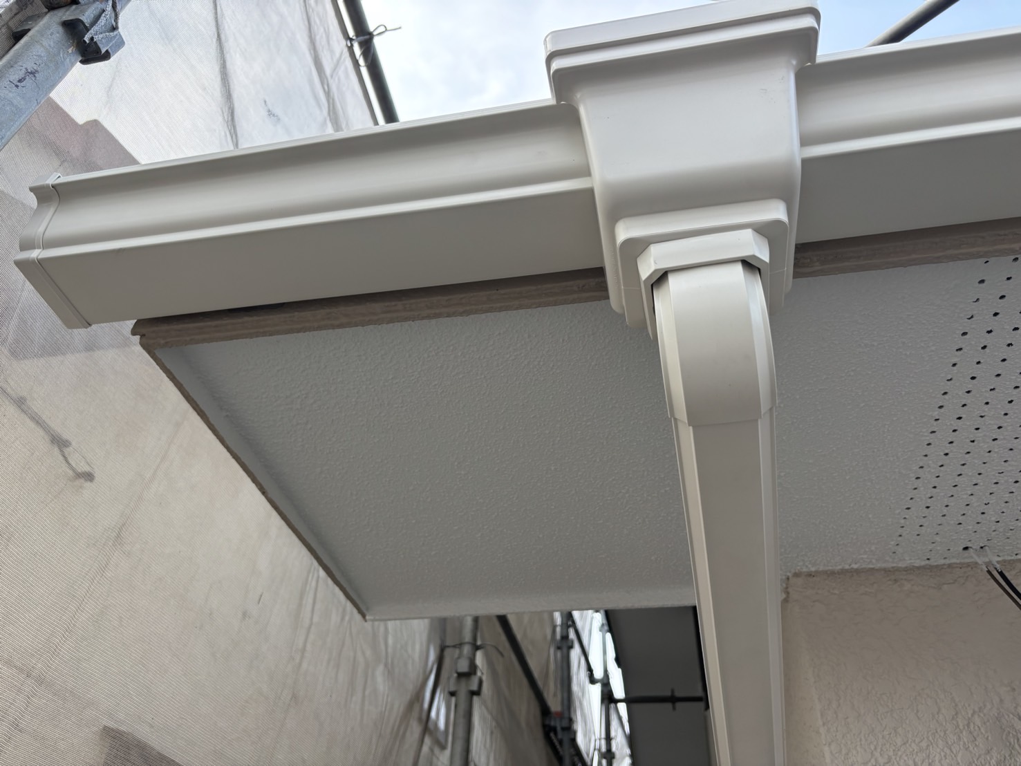 既存の古くなった雨樋を撤去し、新たに**高耐久の塩ビ製角樋(かくとい)**を取り付けました。