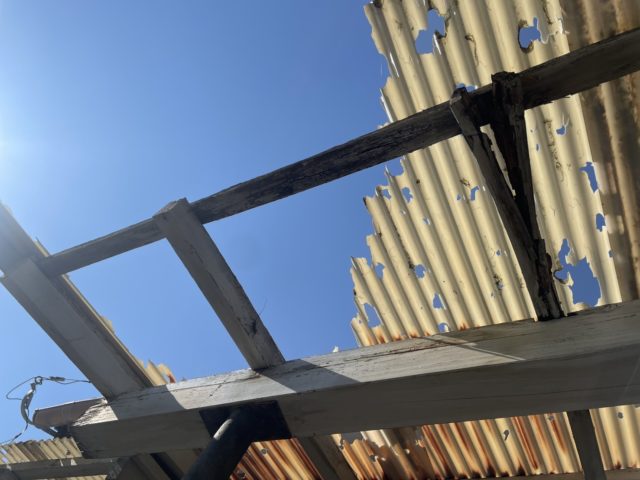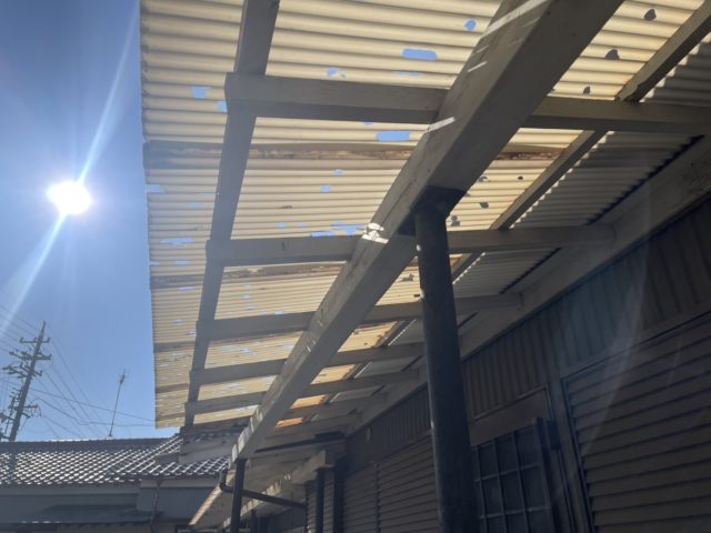 ご覧のように、既存のポリカ波板は長年の風雨によって多くの穴が開き、光が漏れてしまう状態でした。ところどころ割れも見られ、木下地も部分的に傷んでいました。