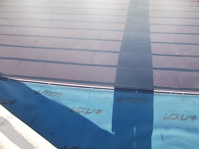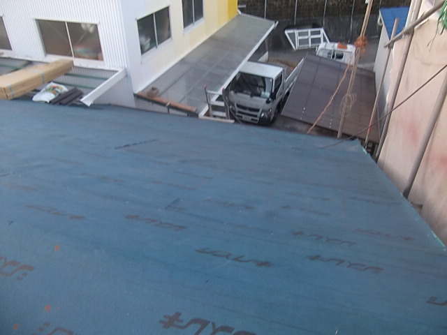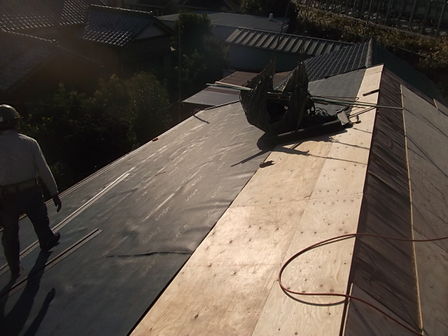 新しい屋根材を施工する前に、防水シートを全面に張ります。