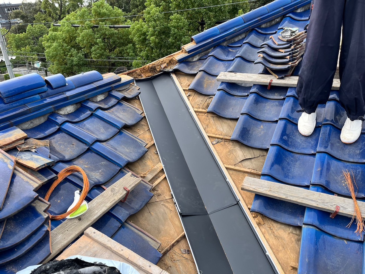 谷部周辺の瓦を丁寧にめくり、既存の銅板を撤去しました。