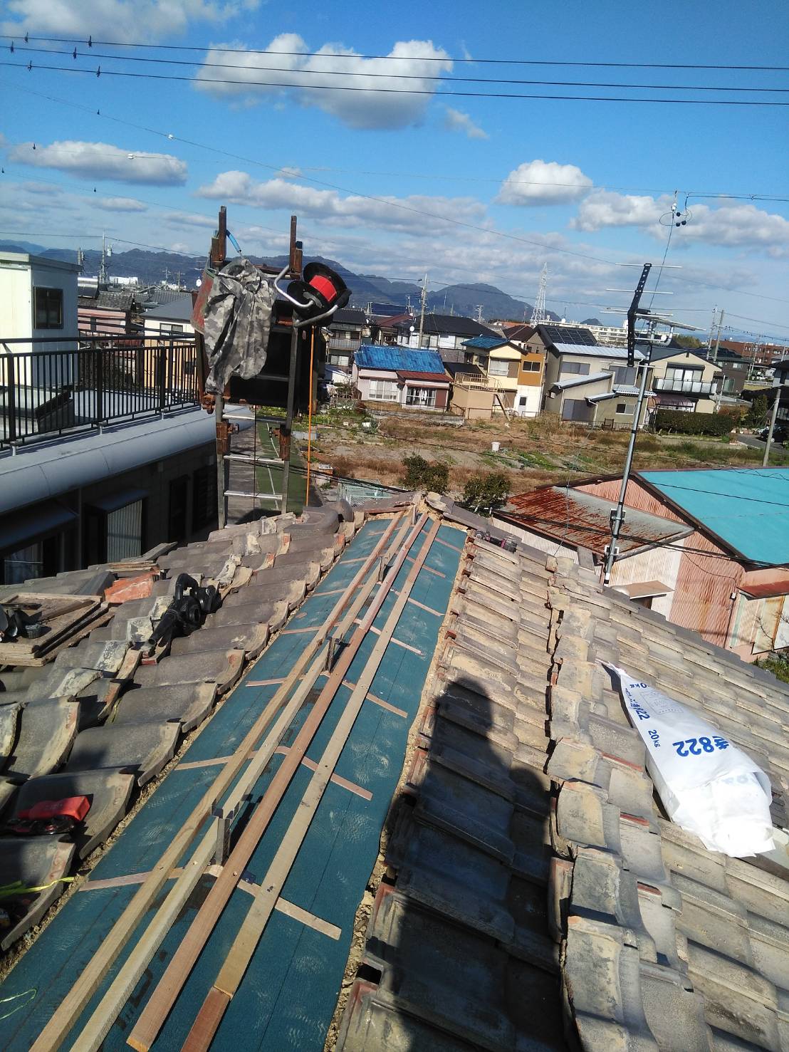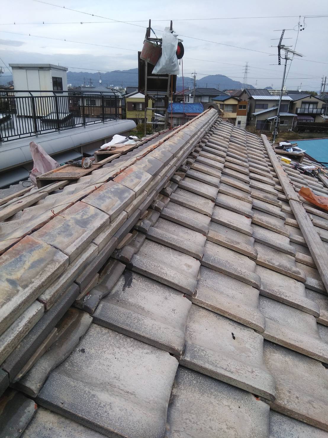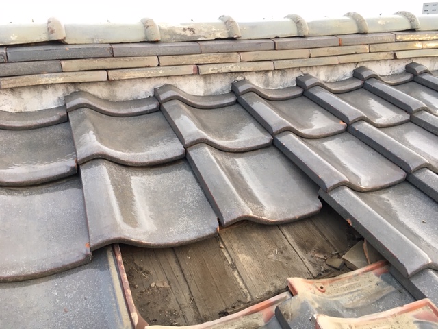 確認すると、棟部分や瓦の下にあるルーフィング(防水紙)の劣化が原因で雨水が浸入していました。長年の風雨により下地の土や木材も一部傷んでいたため、葺き直し工事を行いました。