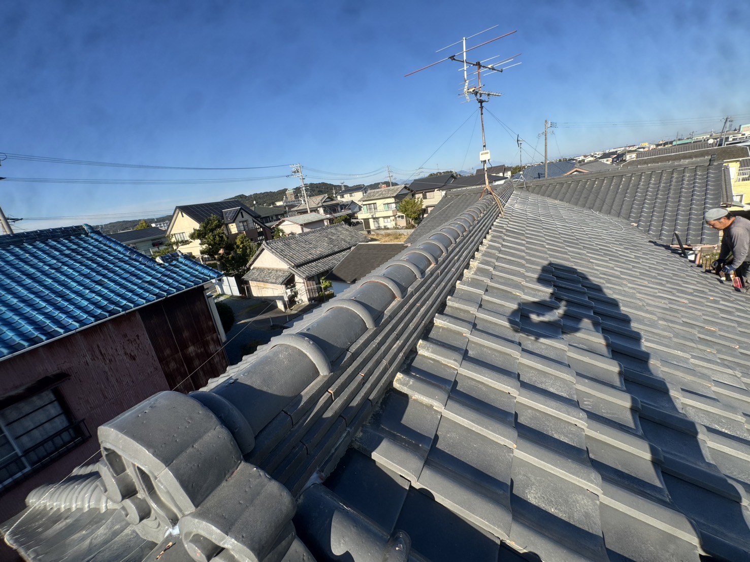 新しい棟瓦を積み直し、しっかりと固定して工事完了。