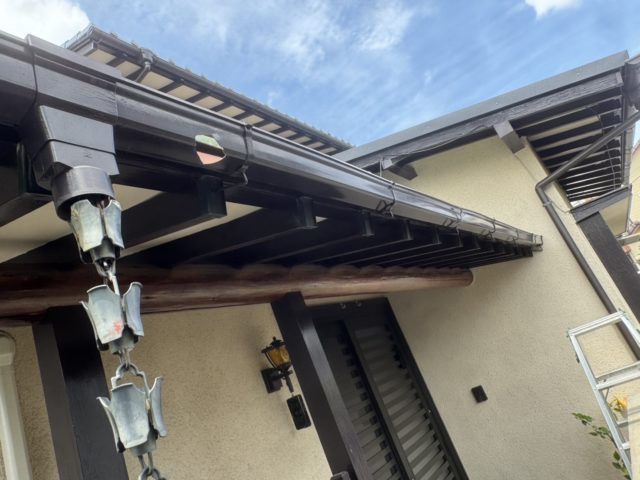 また、勾配(こうばい/水の流れる傾き)を調整し、スムーズに水が流れるように取り付け直しました。樋の繋ぎ目や支持金具も新しくなり、見た目もきれいに仕上がりました。