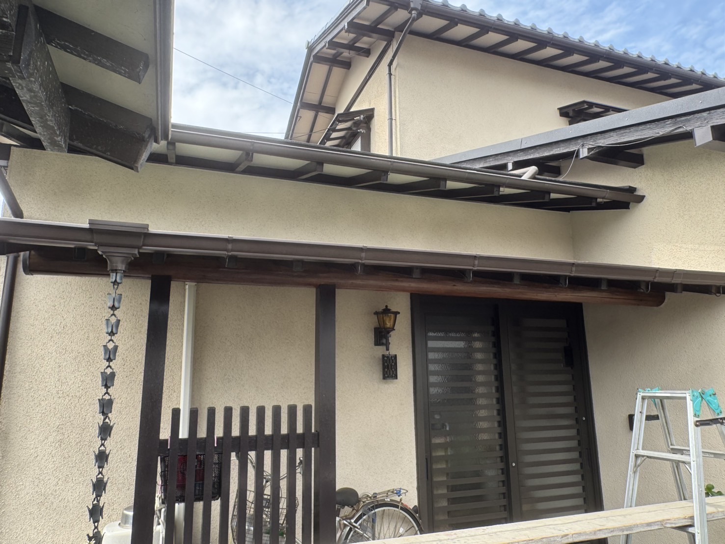 雨樋が正しく機能しないと、屋根からの雨水が直接地面に落ちてしまい、外壁を汚したり、基礎の劣化につながる恐れがあります。特に強い雨の日には、軒先から大量の水が流れ落ちるため、お客様も心配されていました。