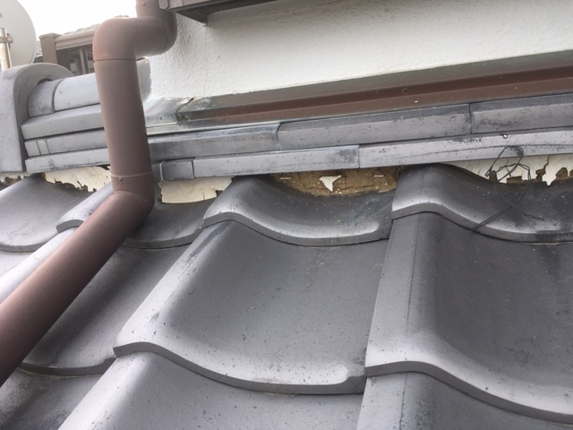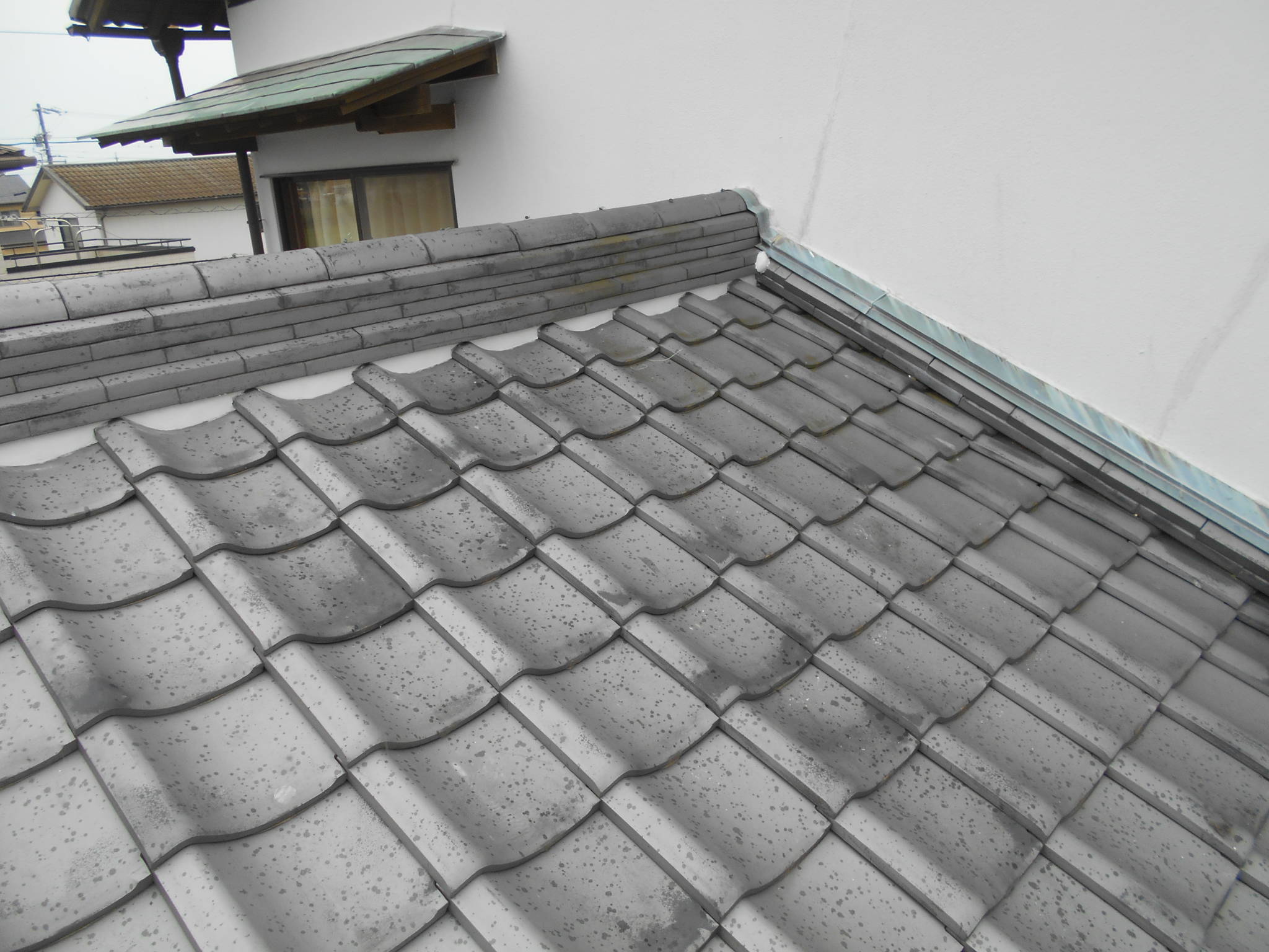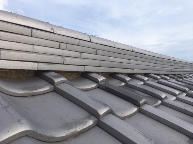 補修後の写真です。棟下の白い部分が新しく塗り直した漆喰です。きれいに仕上がり、雨水の侵入をしっかり防げる状態になりました。
