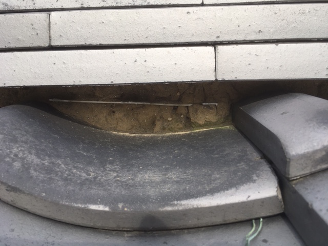 棟の下部分の漆喰が劣化し、土が露出している状態でした。漆喰が剥がれると、瓦のズレや雨水の侵入、棟の崩れにつながるおそれがあります。