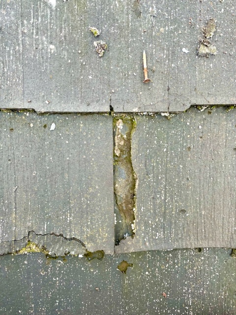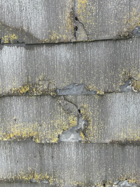 既存の屋根材はカラーベストの「パミール」でしたが、経年劣化が進み、表面の剥離やひび割れが多数発生していました。特にパミールは経年で層状に剥がれてしまう特徴があり、塗装での延命が難しい屋根材です。