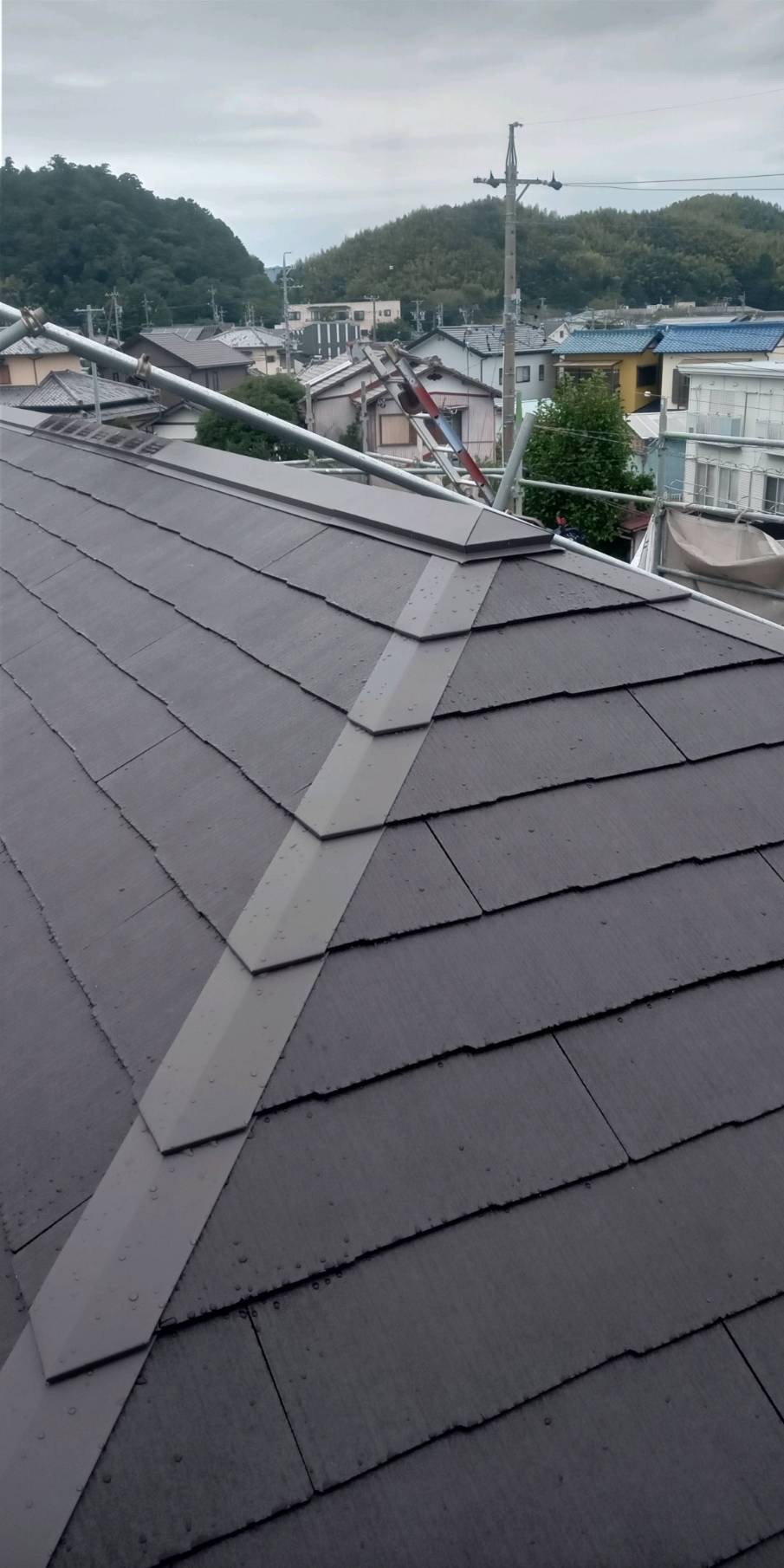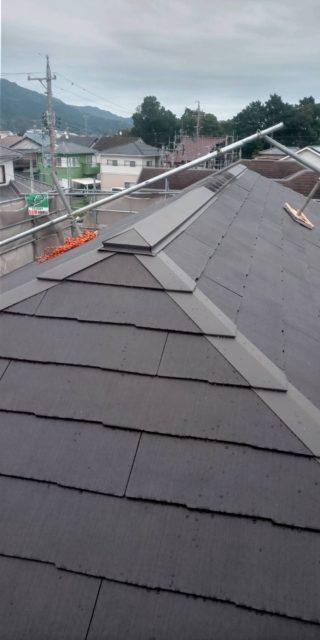 今回はKMEW(ケイミュー)製の「コロニアルグラッサ」を採用。美しい仕上がりと優れた耐候性が特徴の屋根材です。表面には高耐候性のグラッサコートが施されており、紫外線や雨風による色あせ・劣化を長期間抑えてくれます。 - 棟板金の取り付け