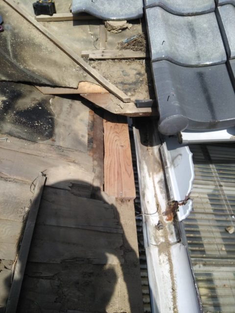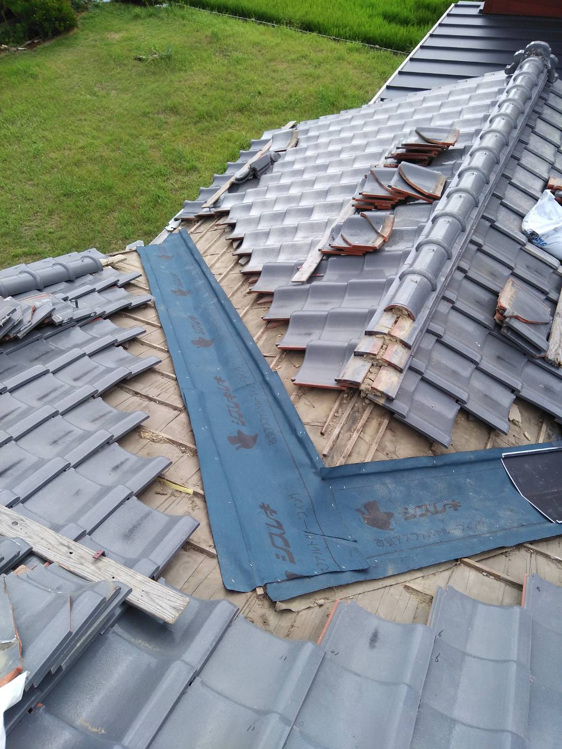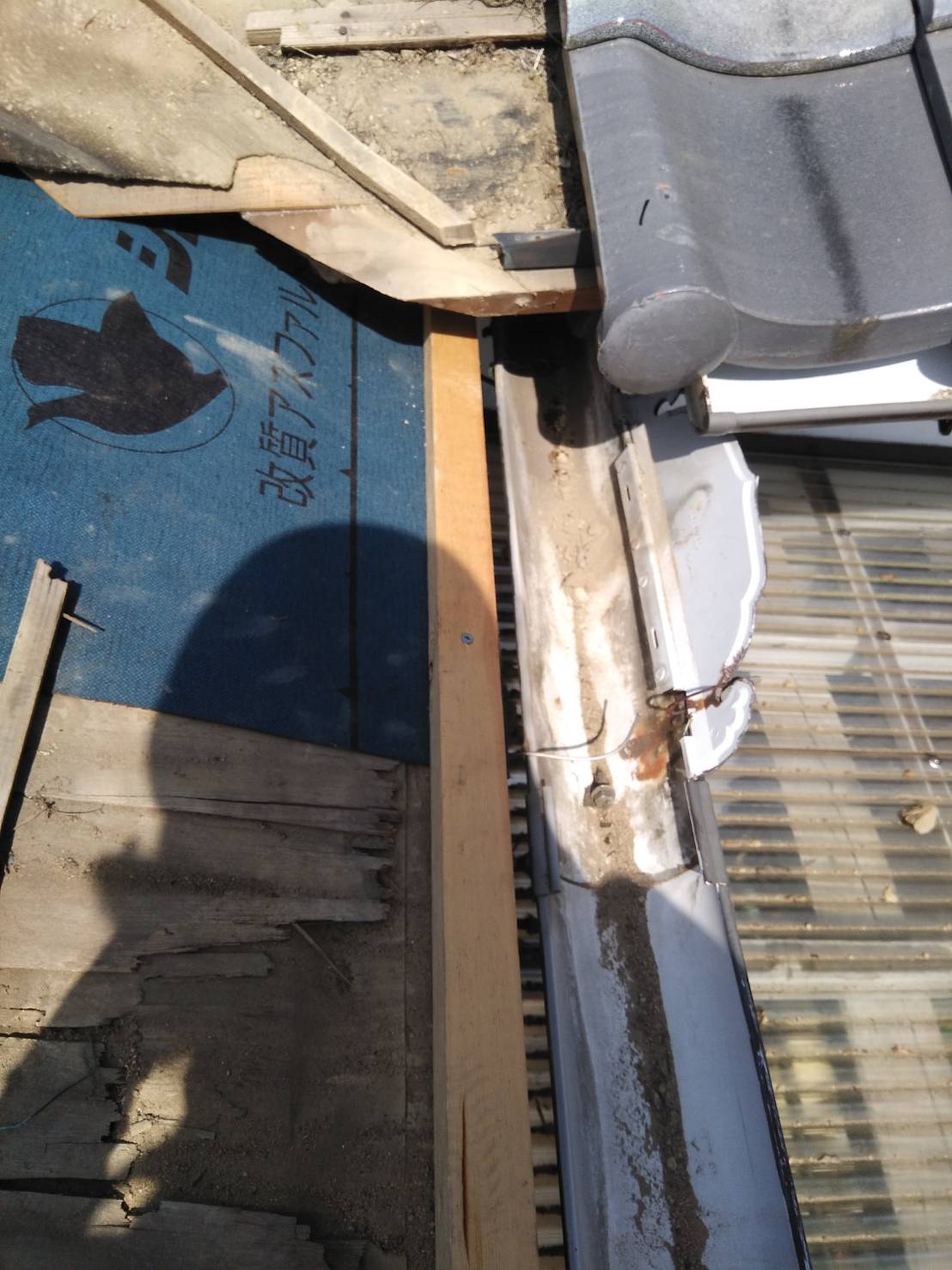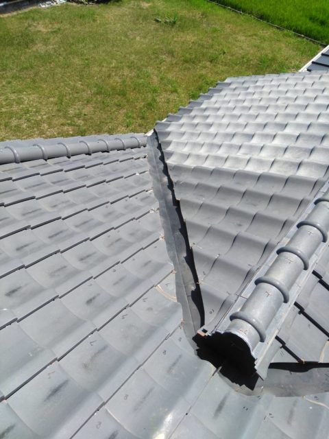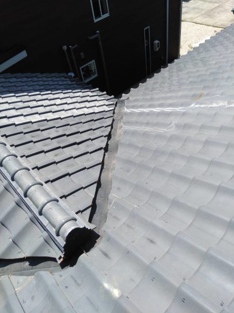 まずは谷部分の瓦を丁寧に取り外し、内部の状態を確認しました。長年の雨水で土が流れ、下地が傷んでいる箇所が見つかりました。