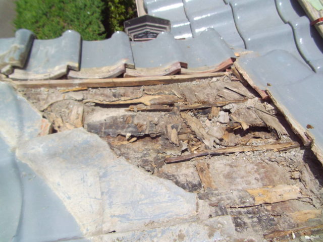 瓦屋根は耐久性に優れていますが、経年劣化や施工方法の不具合によって雨漏りが発生することがあります。今回の現場では、棟部分や下地が劣化し、実際に雨漏りの症状が出ていました。