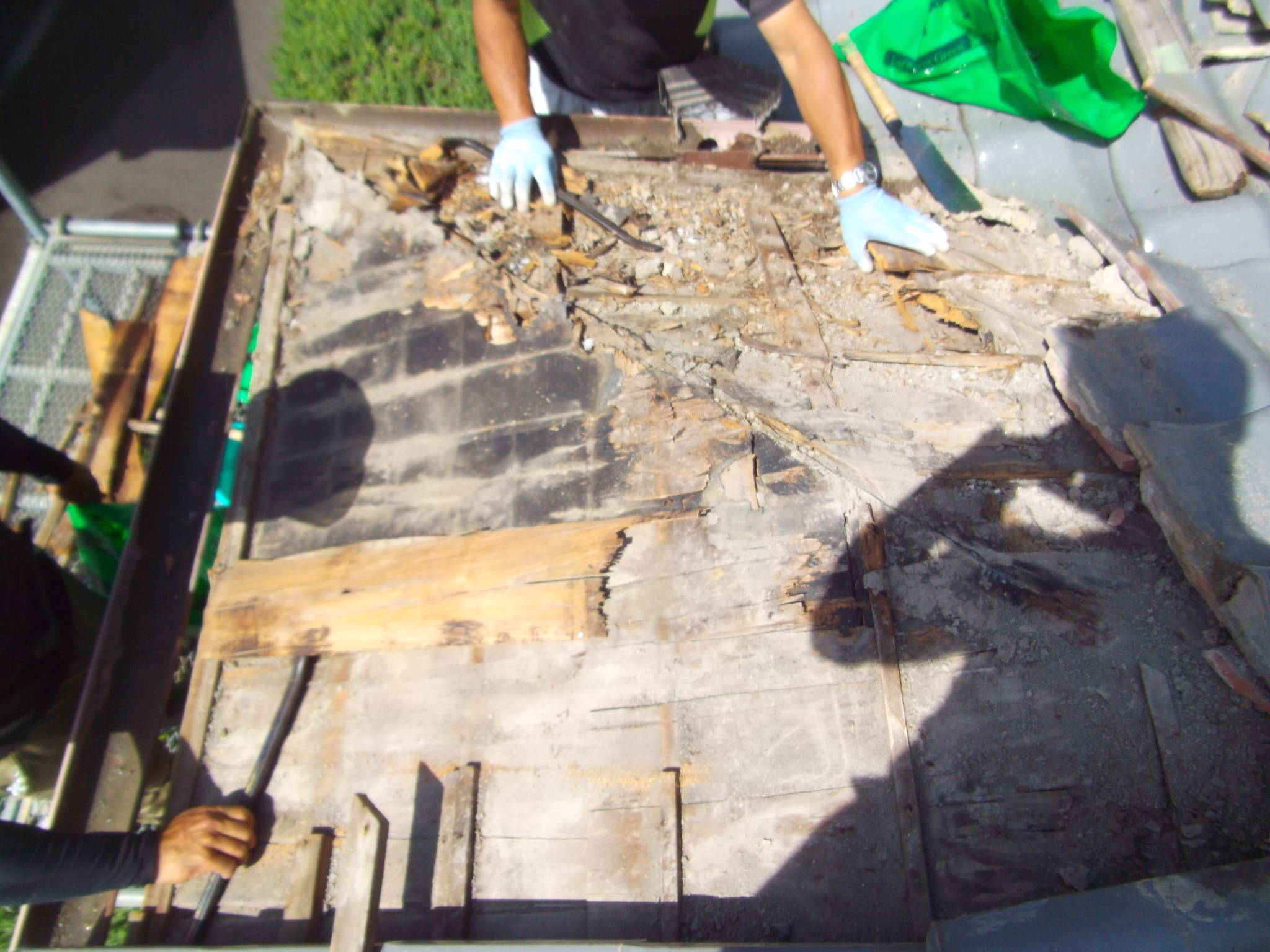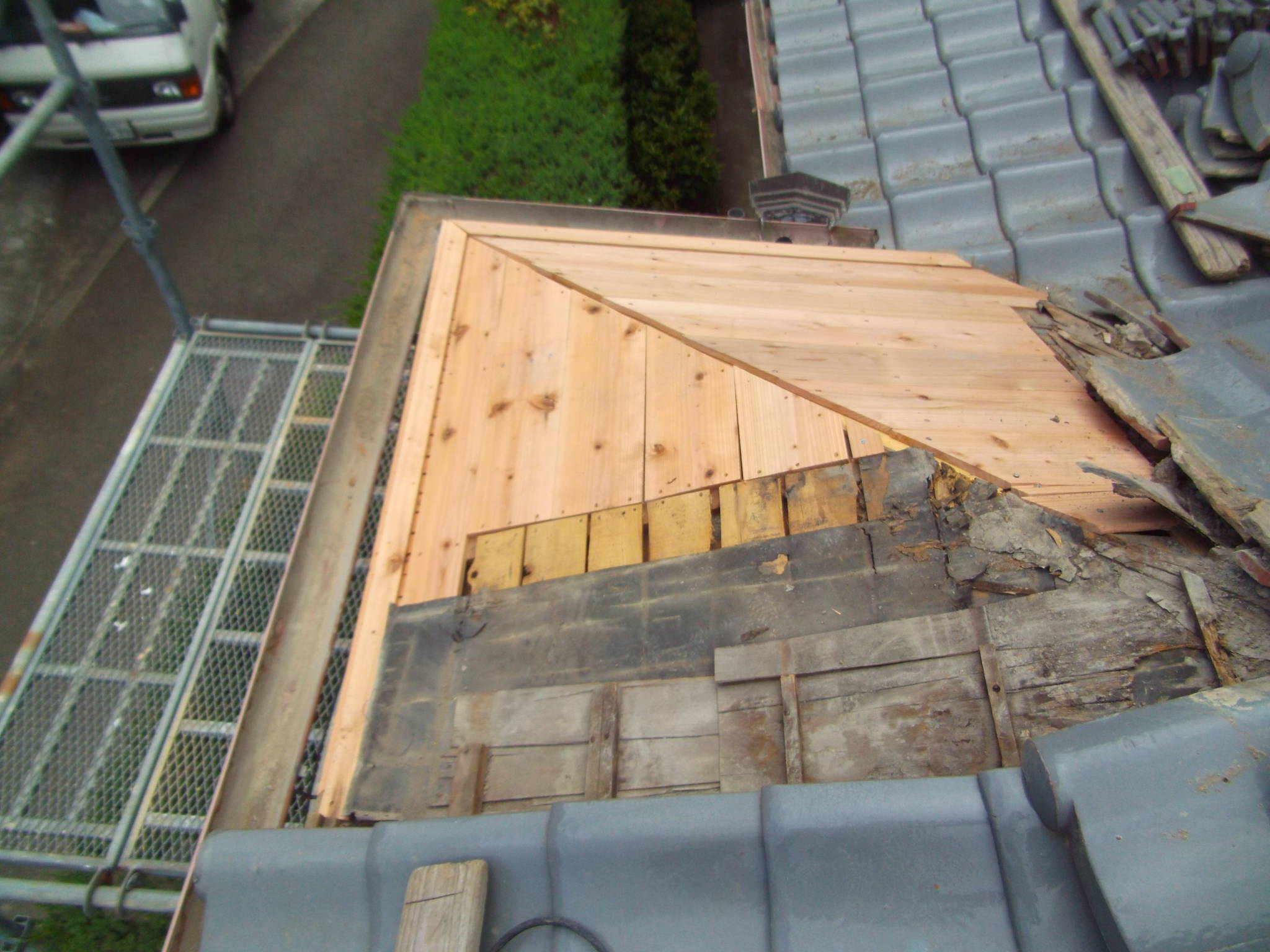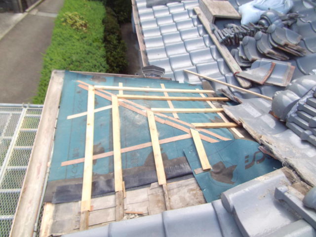 - まず棟瓦を丁寧に解体し、内部の腐食した木材を撤去しました。
