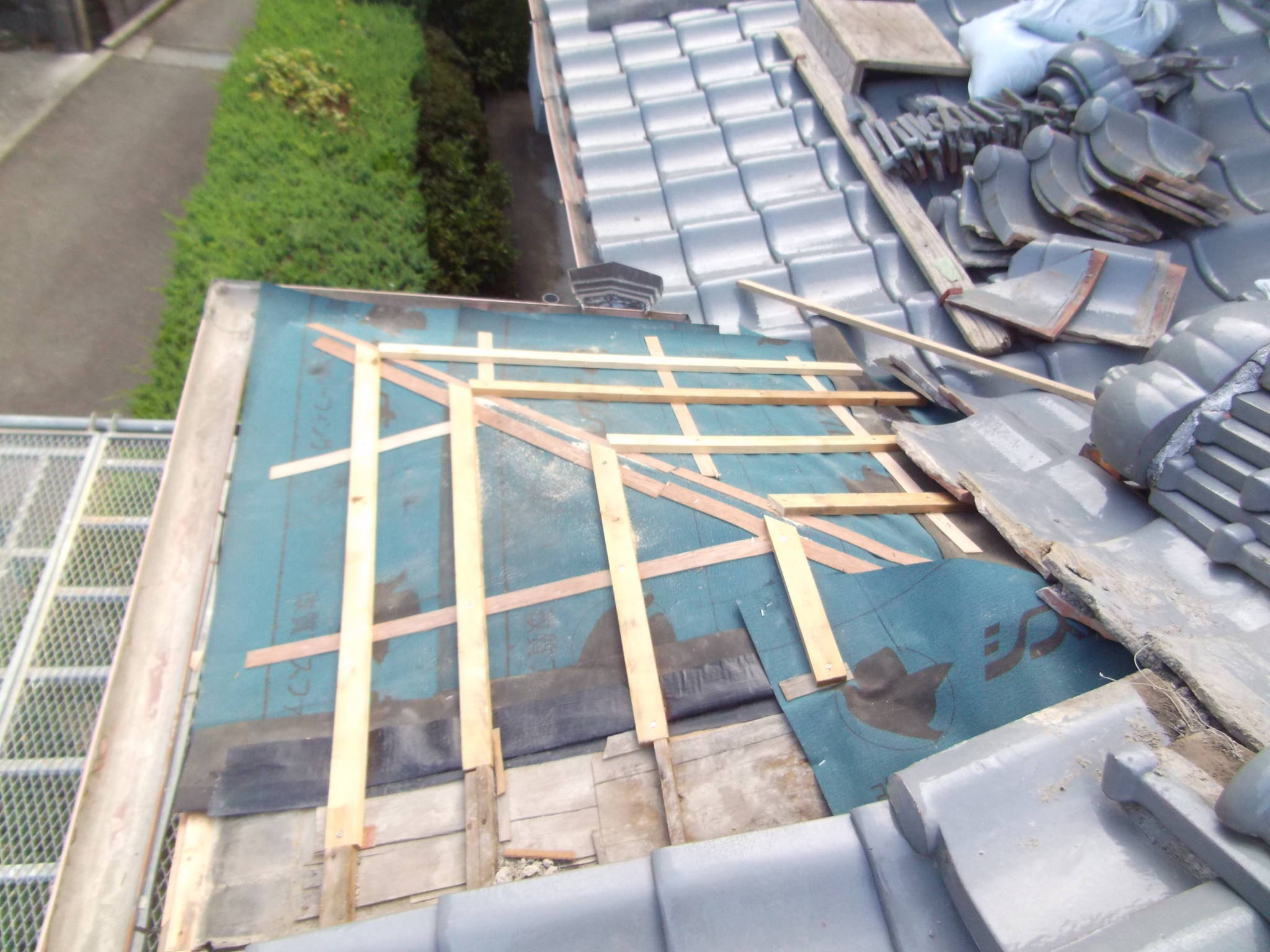 - 新しい木材で下地を補強し、さらに防水シート(ルーフィング)を敷設。