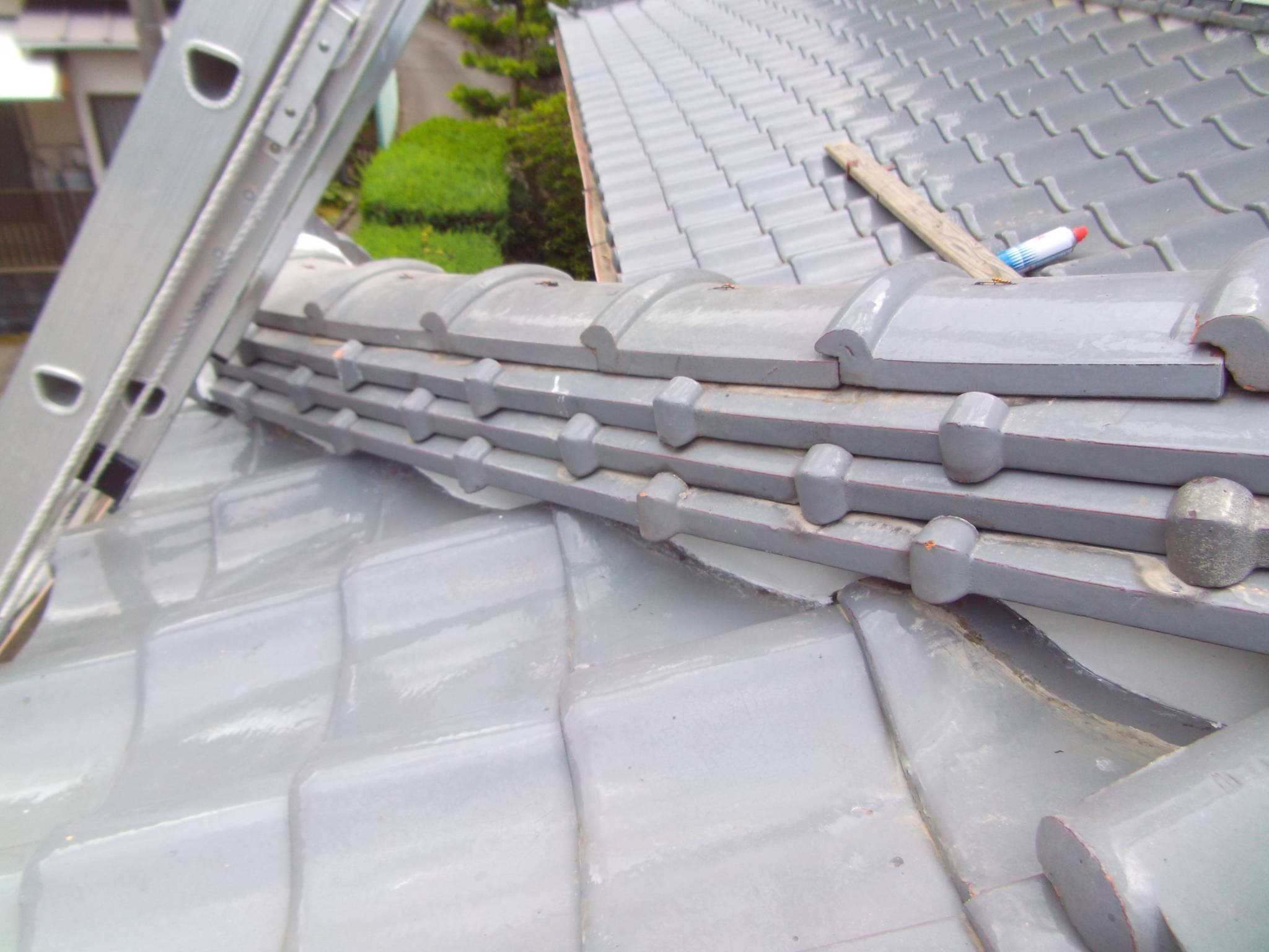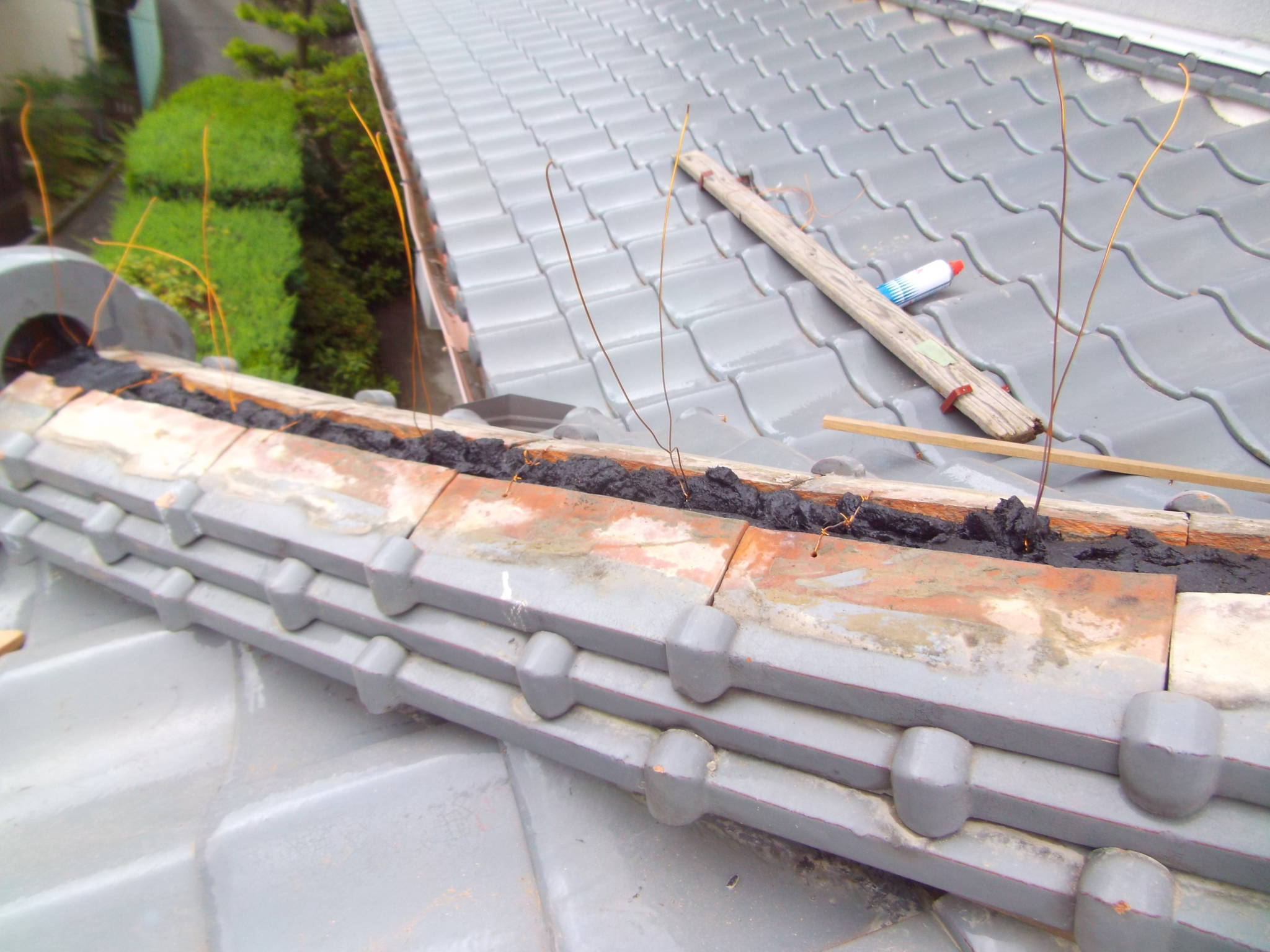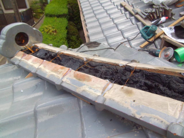 - その上から瓦を正しく積み直し、銅線でしっかりと固定しました。