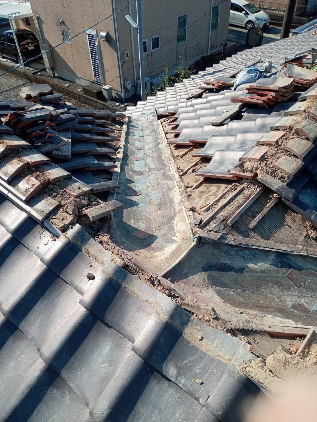 お客様より「屋根から雨漏りしているようだ」とご相談を受け、現地調査を行ったところ、谷部分の板金の劣化と棟部分の歪みやズレが確認されました。長年の風雨や地震によって、瓦の下に施工されている土や南蛮漆喰が劣化し、雨水の通り道が乱れてしまっていました。