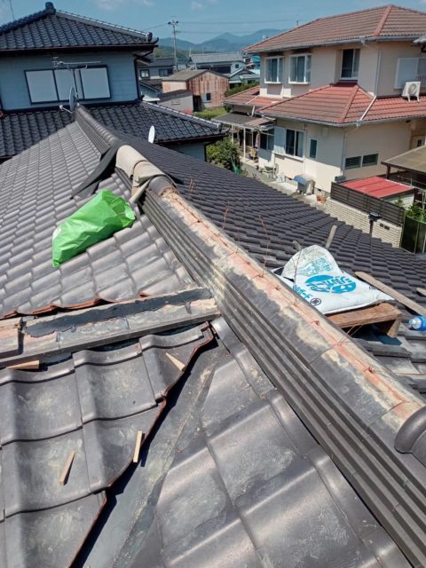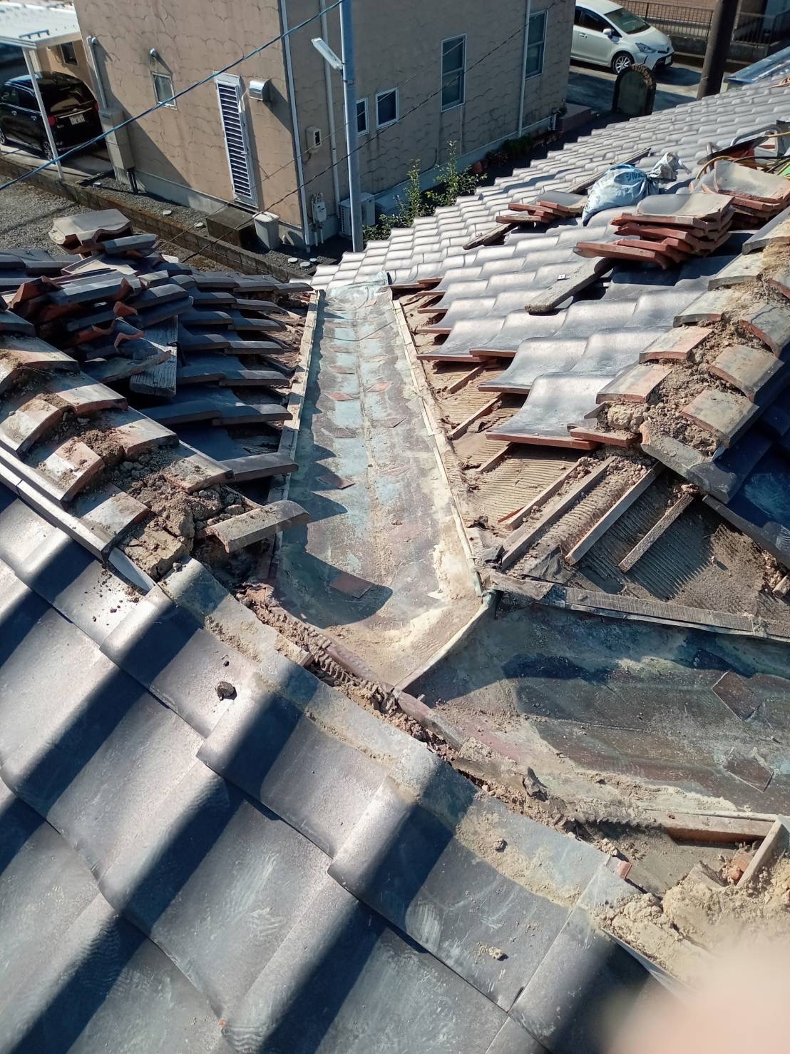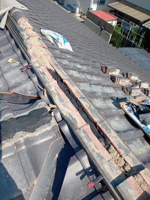 まずは棟の取り直しからスタートしました。古い棟瓦を慎重に取り外し、内部の劣化した葺き土を撤去。その後、新たに南蛮漆喰でしっかりと下地を作り直し、棟瓦を丁寧に積み直しました。