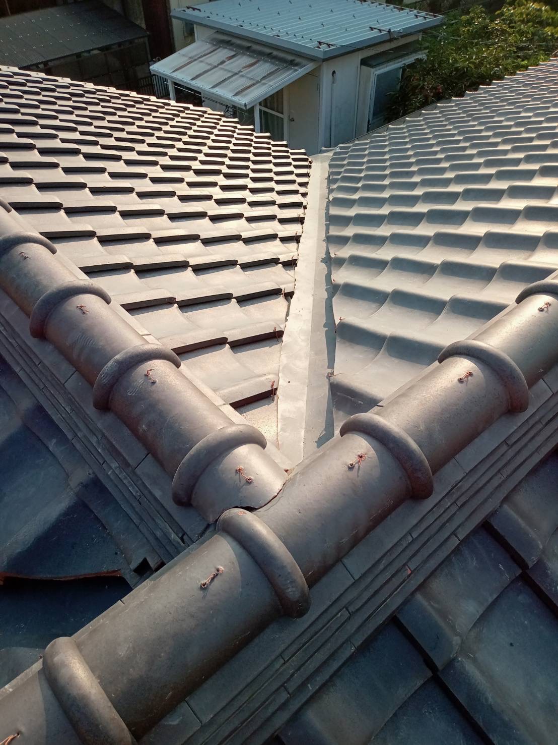 施工後は、棟のラインも真っすぐになり、見た目も美しく仕上がりました。谷部分も新品の板金でしっかりと補強され、これで今後の雨でも安心してお過ごしいただけます。