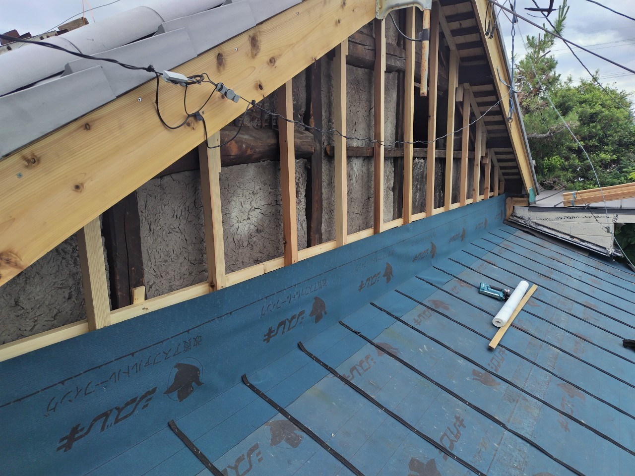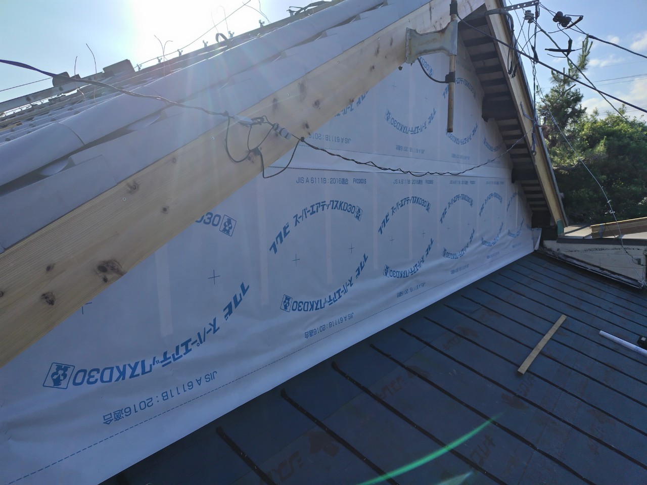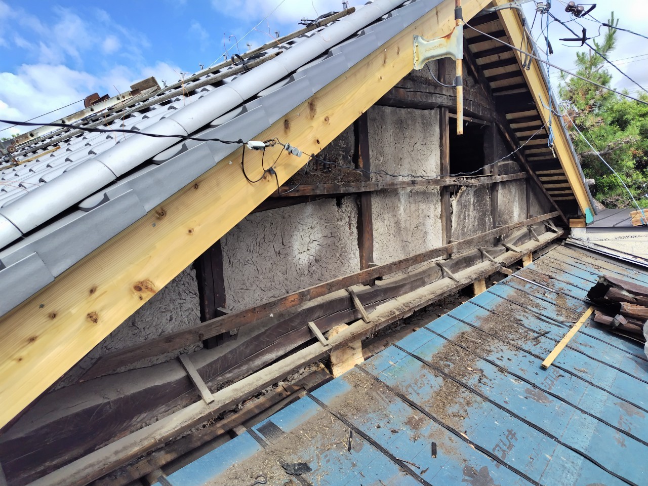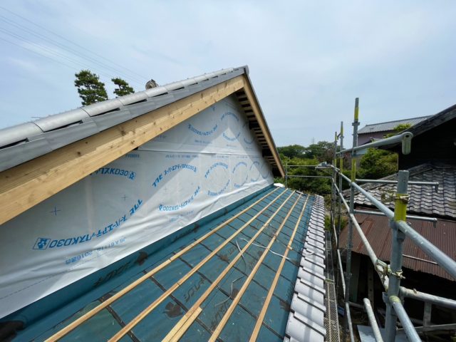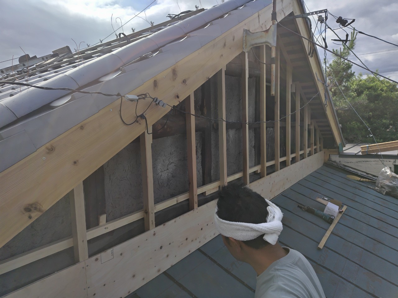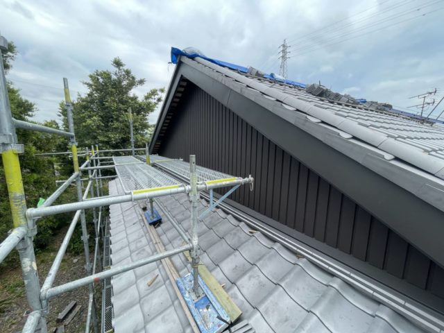 藤枝市 板金工事 |丸寿瓦工業株式会社 板金工事 葺き替え工事のM様邸の板金工事です。 屋切りの壁、破風板、雨押えの板金工事を請けさせていただきました。 かなり古い木の羽目を一度撤去してから工事がスタートしていきます。 既存の木材を撤去。 既存の下地の不陸を調整し、木材を加工しながら取り付け。 防水シートを張り、雨仕舞を良くします。 壁の不陸も直したのでまっすぐきれいに板金が仕上がりました。