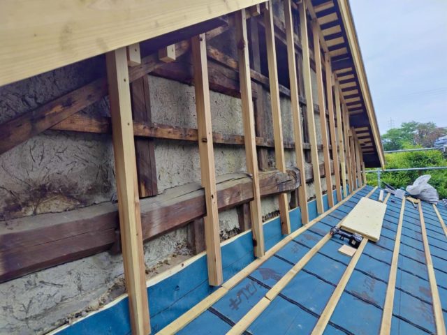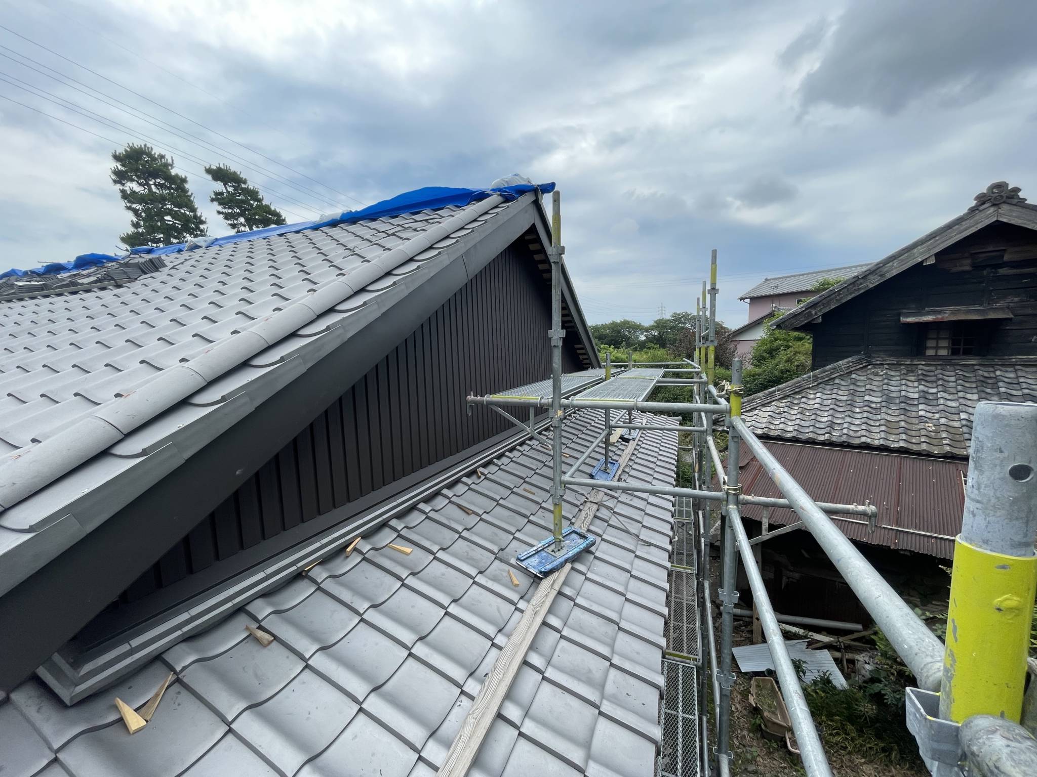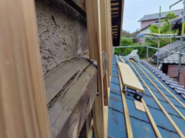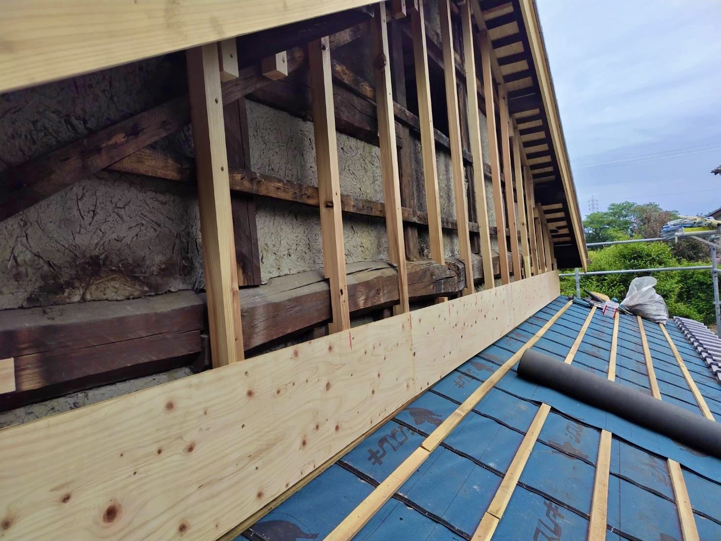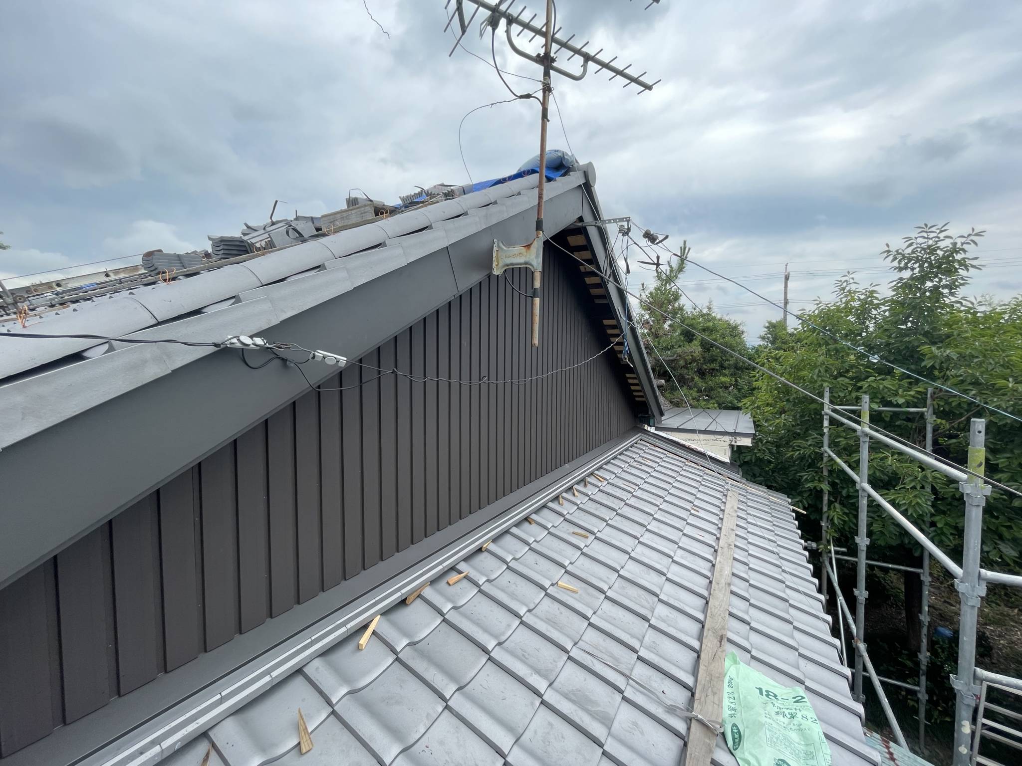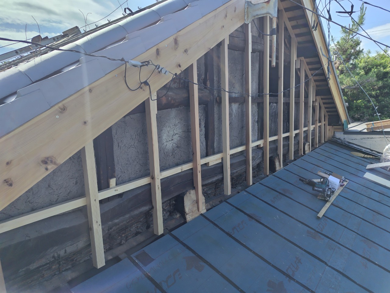 藤枝市 板金工事 |丸寿瓦工業株式会社 板金工事 葺き替え工事のM様邸の板金工事です。 屋切りの壁、破風板、雨押えの板金工事を請けさせていただきました。 かなり古い木の羽目を一度撤去してから工事がスタートしていきます。 既存の木材を撤去。 既存の下地の不陸を調整し、木材を加工しながら取り付け。 防水シートを張り、雨仕舞を良くします。 壁の不陸も直したのでまっすぐきれいに板金が仕上がりました。