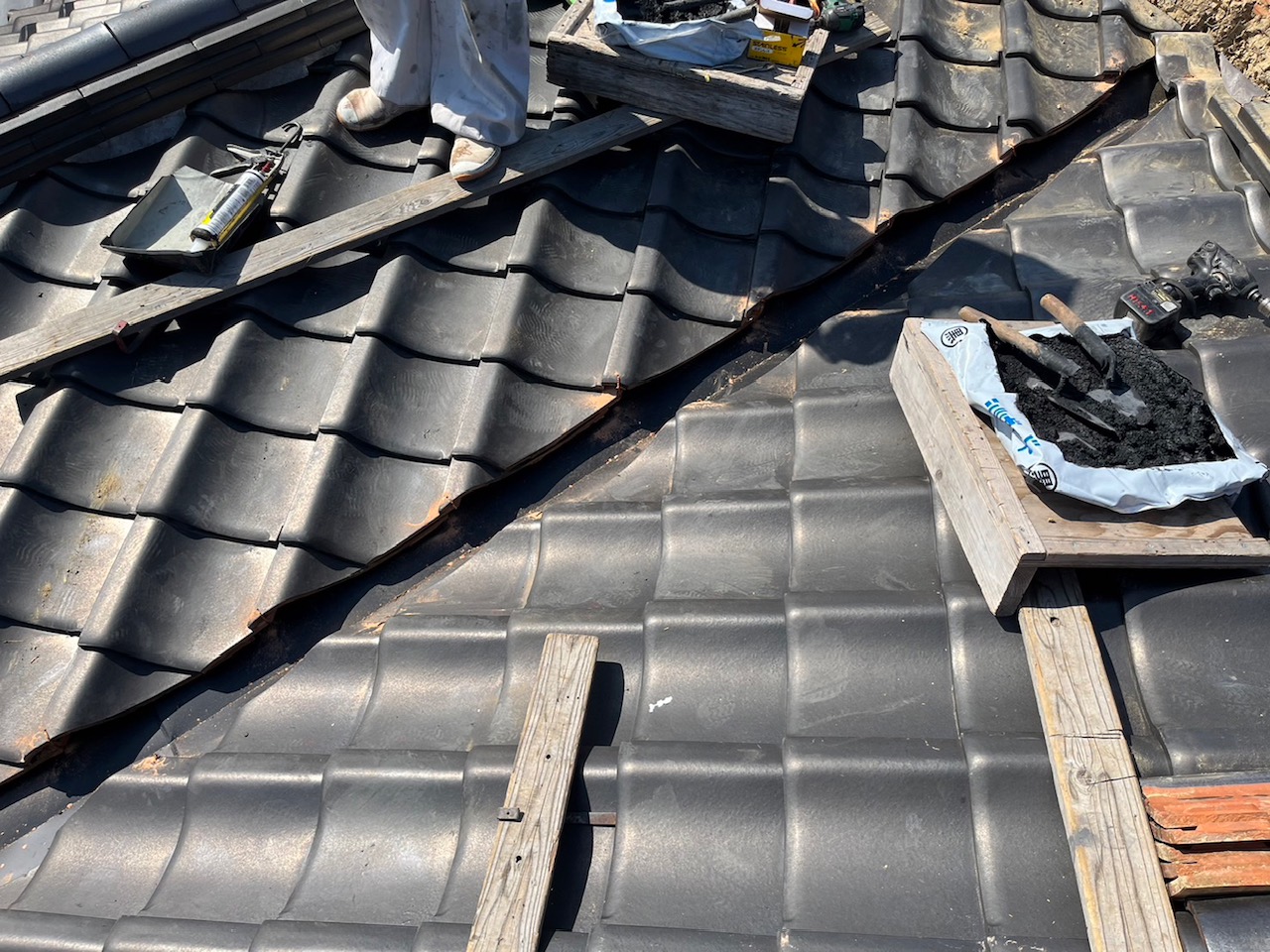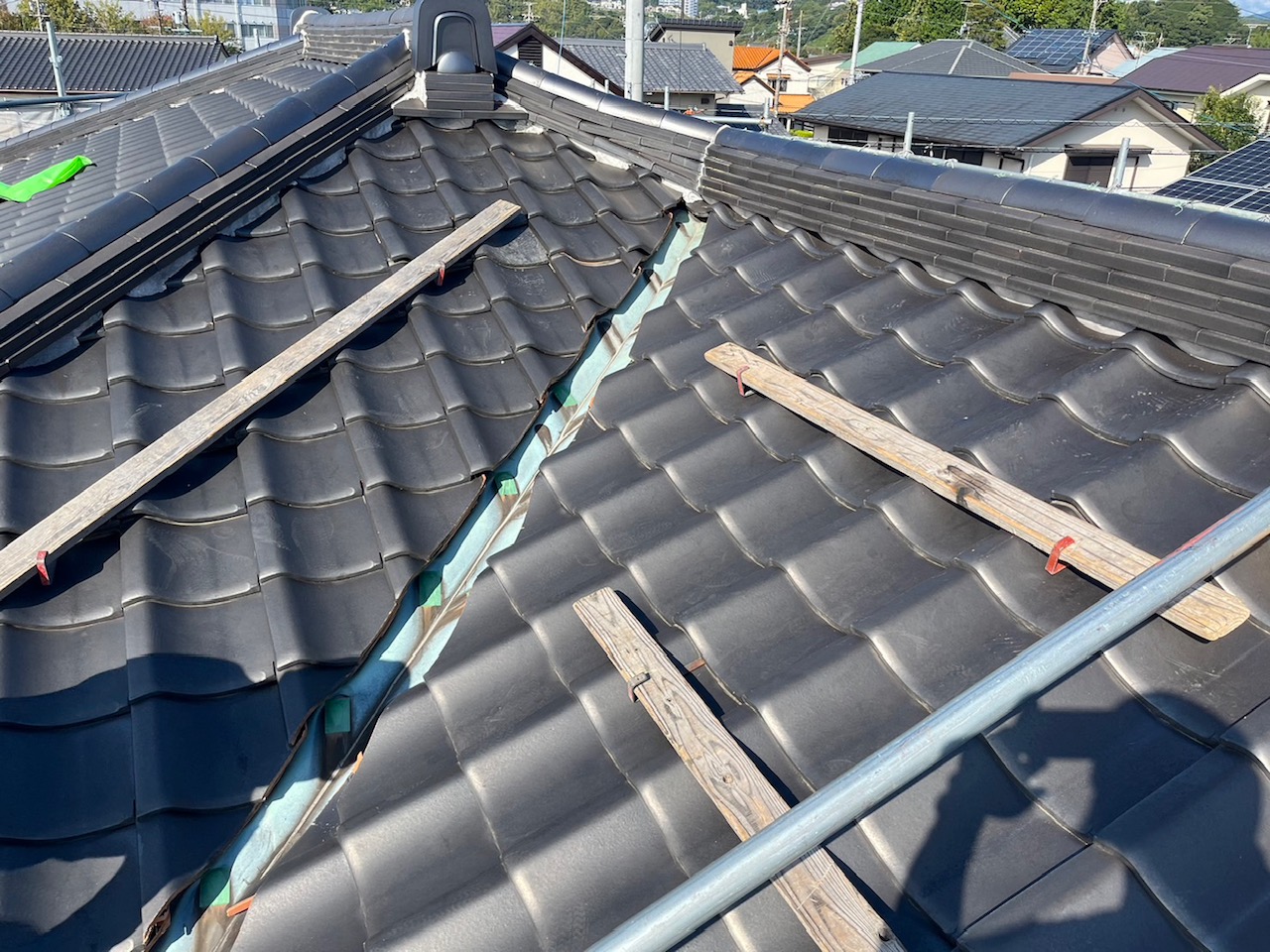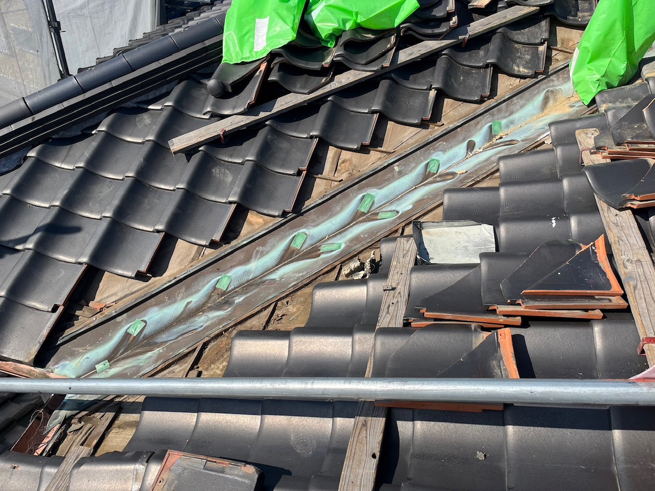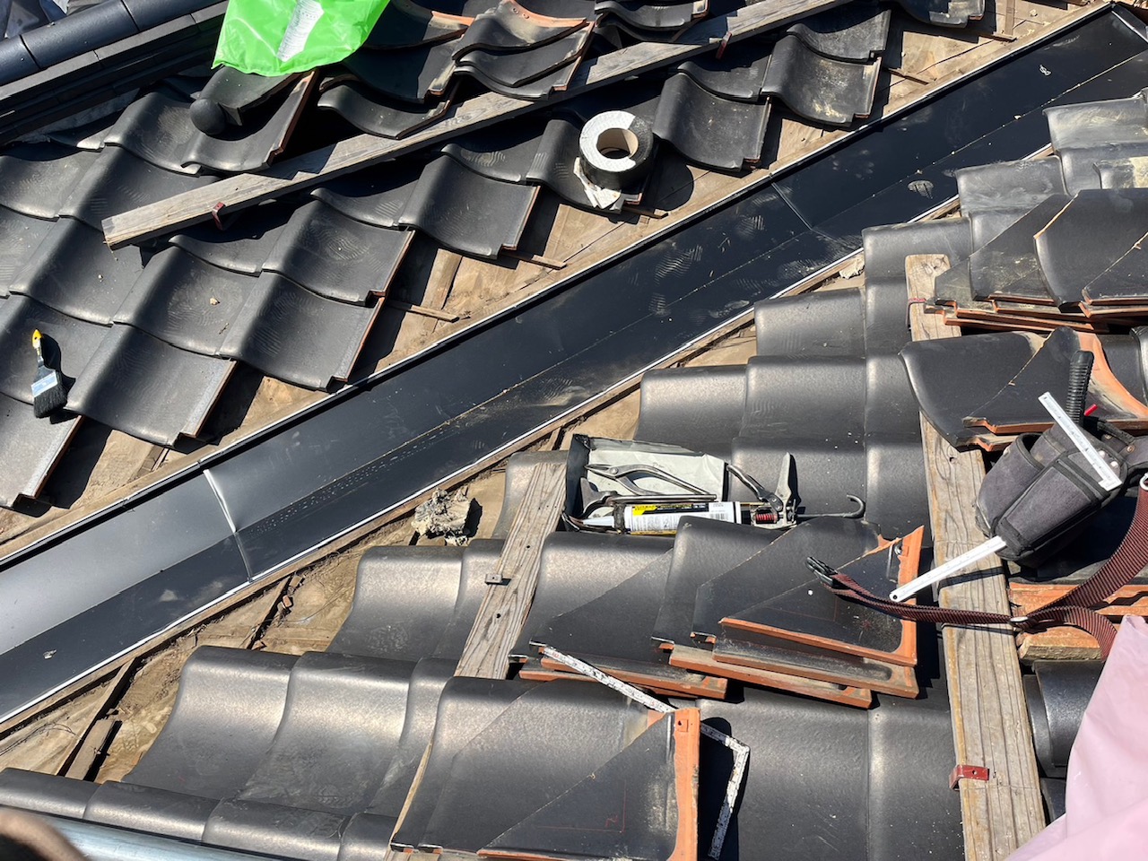 まずは、谷部の板金を剥がすのに廻りの瓦を剥がしていきます。
