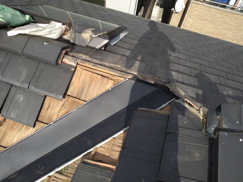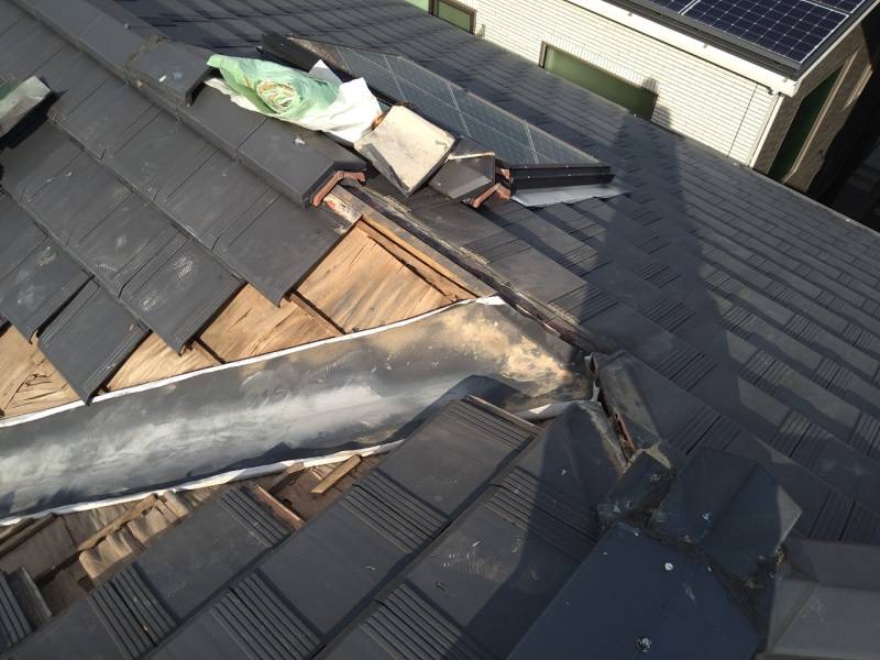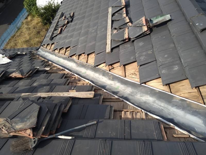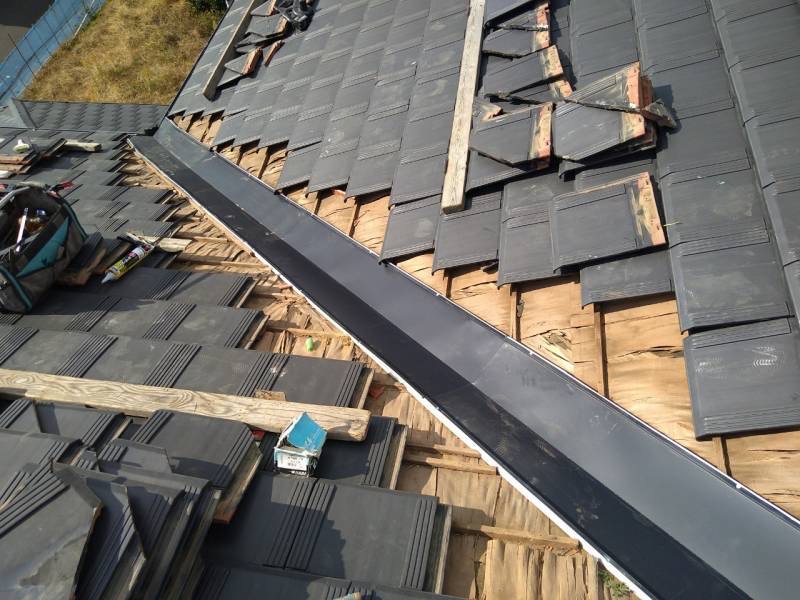 まずは雨漏りの発生している谷部分の瓦を丁寧に取り外しました。瓦は一度外すと再利用できるものが多いため、割れや欠けがないかを確認しながら作業を進めます。