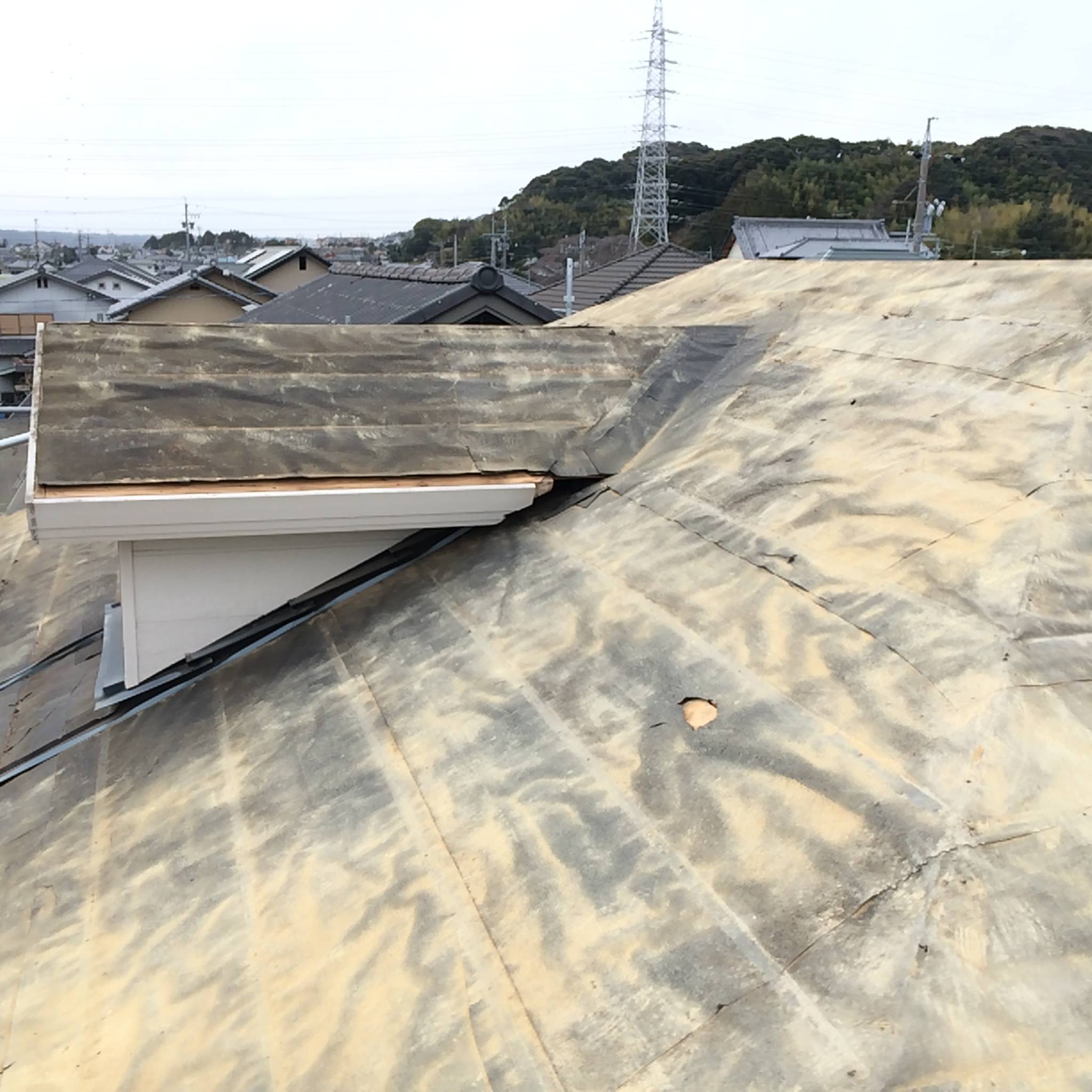 既存の屋根をめくって確認すると、防水シート(ルーフィング)が破れていたり、ところどころ穴が空いている部分が見受けられました。特に棟部や下屋根との取り合い部分は雨水が侵入しやすく、放置すると野地板の腐食や室内への雨漏りに繋がる危険がありました。